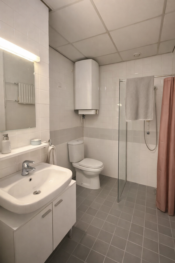 Aan de andere zijde van de woning bevindt zich de badkamer, uitgerust met een toilet, douche en een wastafel met spiegel en verlichting. Ook bevindt de studio zich op het zuiden en zijn er ook zonneschermen aanwezig.