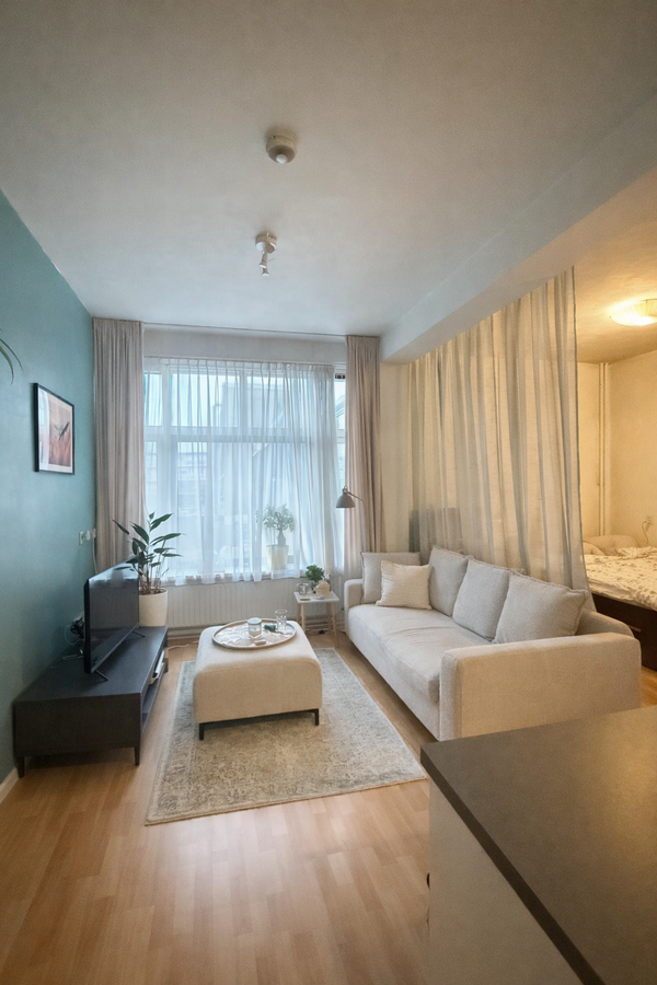 Vanaf de voordeur van de studio stap je direct het woon- en slaapgedeelte binnen. Aan de linkerkant bevindt zich de moderne keuken met kookeiland, die is voorzien van een ingebouwde vaatwasser, koelkast met vriesvak, combimagnetron en een inductiekookplaat. De keuken heeft een open verbinding met het woongedeelte, waardoor de ruimte licht en overzichtelijk blijft.