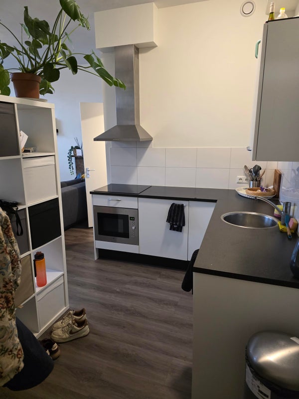 De studio is van alle gemakken voorzien; een mooie pvc vloer, raambekleding, keuken met genoeg kastruimte en diverse inbouwapparatuur.