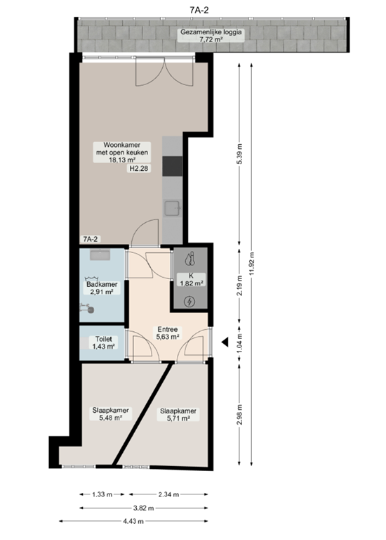 Bij binnenkomst van het appartement kom je terecht in de hal. Vanaf hier is de woonkamer, badkamer, apart toilet en de 2 slaapkamers te bereiken. Ook is er nog een kleine bergruimte gelegen in het appartement. De ruime en lichte woonkamer met open keuken is voorzien van alle luxe inbouwapparatuur en heeft veel lichtinval van buitenaf. Vanaf hier is er een prachtig uitzicht op de binnenstad van Groningen.