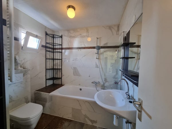 Badkamer met douche, wastafel, toilet, wasmachine en droger.