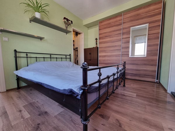 Slaapkamer aan de rustige achterzijde met tweepersoonsbed en grote kledingkast.