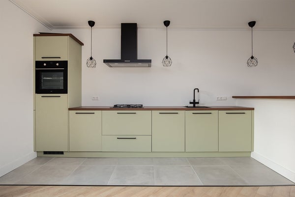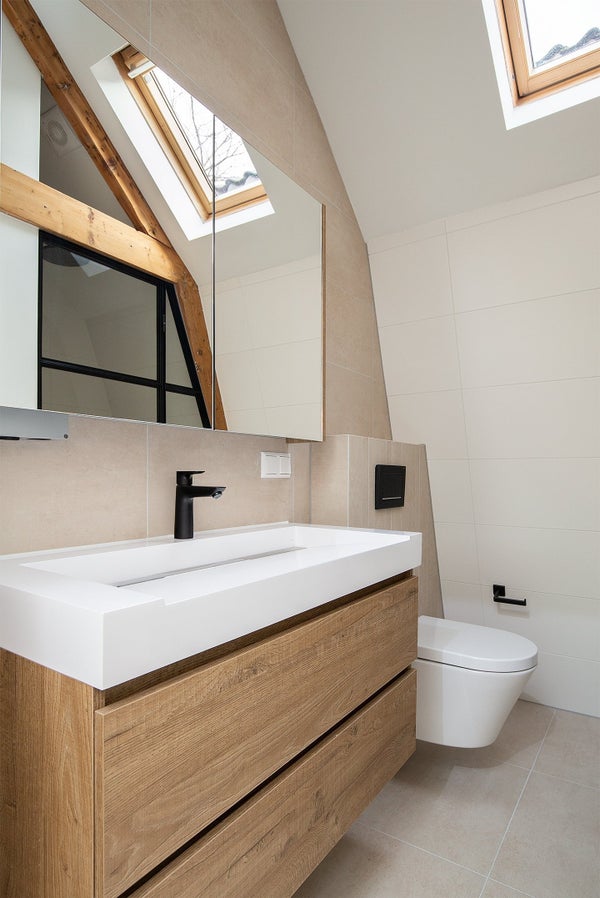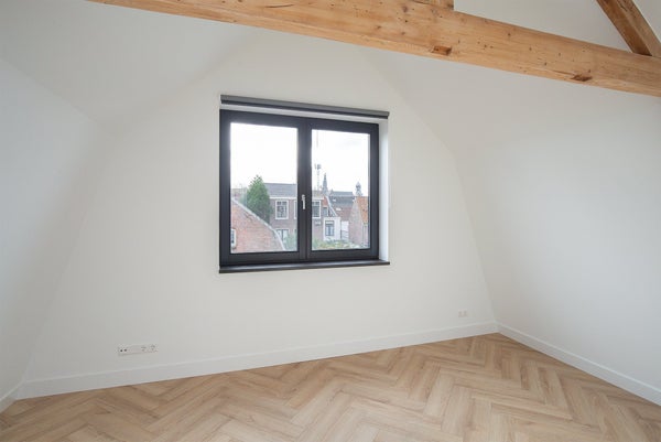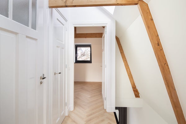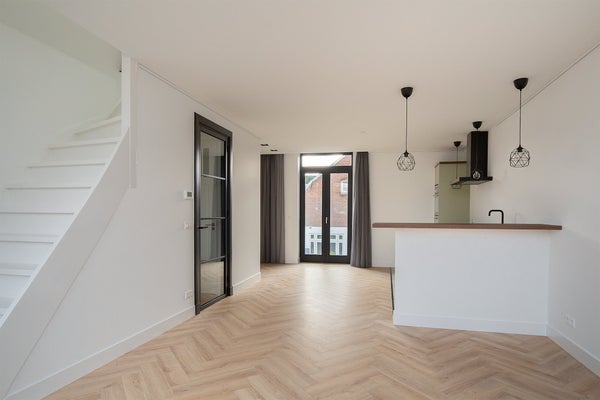 De trendy bovenwoning kenmerkt zich door het gebruik van stijlvolle materialen, zoals een moderne visgraat vloer, zwarte kozijnen en deuren, ingebouwde ligspots.