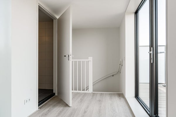 Trap naar 2e verdieping: overloop met toegang naar terras. Slaapkamer en ruime badkamer met inloopdouche, wastafel en toilet.