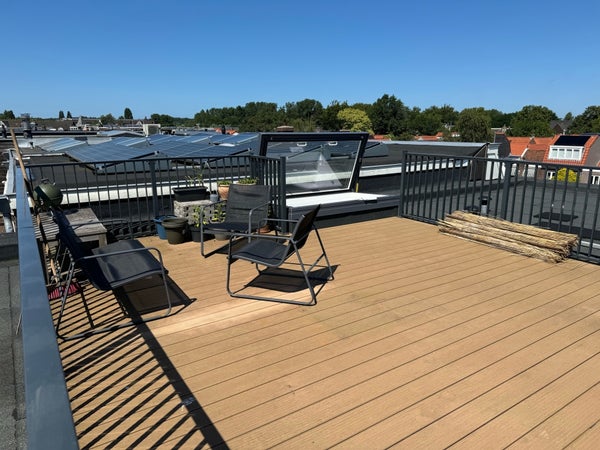 Hal, voordeur, ruime en brede woonkamer die zeer goed is in te delen met een open keuken voorzien van alle benodigde apparatuur; koelkast, ruime vriezer, inductieplaat, vaatwasser en oven combinatie. Vanuit de woonkamer vervolgens door de gang zijn zowel de badkamer als beide slaapkamers te bereiken en een apart toilet. Beide kamers meer dan volwaardig met mooie op maat gemaakte inbouwkasten. Moderne badkamer met sfeervol wasmeubel en riante inloopdouche. Grenzend aan de badkamer bevindt zich een wasruimte waar een wasmachine geplaatst kan worden. Het hele appartement is comfortabel verwarmd met vloerverwarming. Dakterras van maar liefst ca. 30m2 te bereiken via vaste trap!