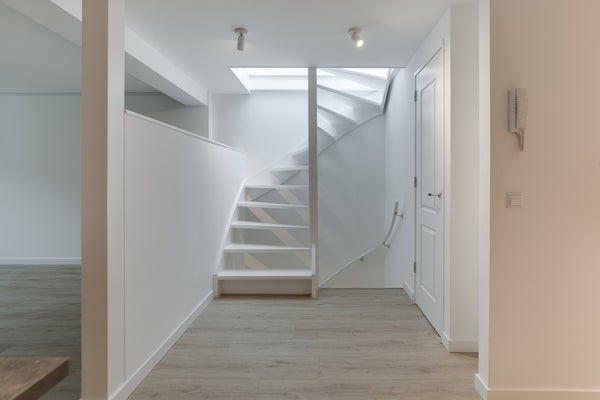 Gezamenlijk entree (in totaal 2 appartementen) welke ruim is opgezet met riante berging (passend voor meerdere fietsen) in de hal, meterkast en lange gang naar de trap naar boven;