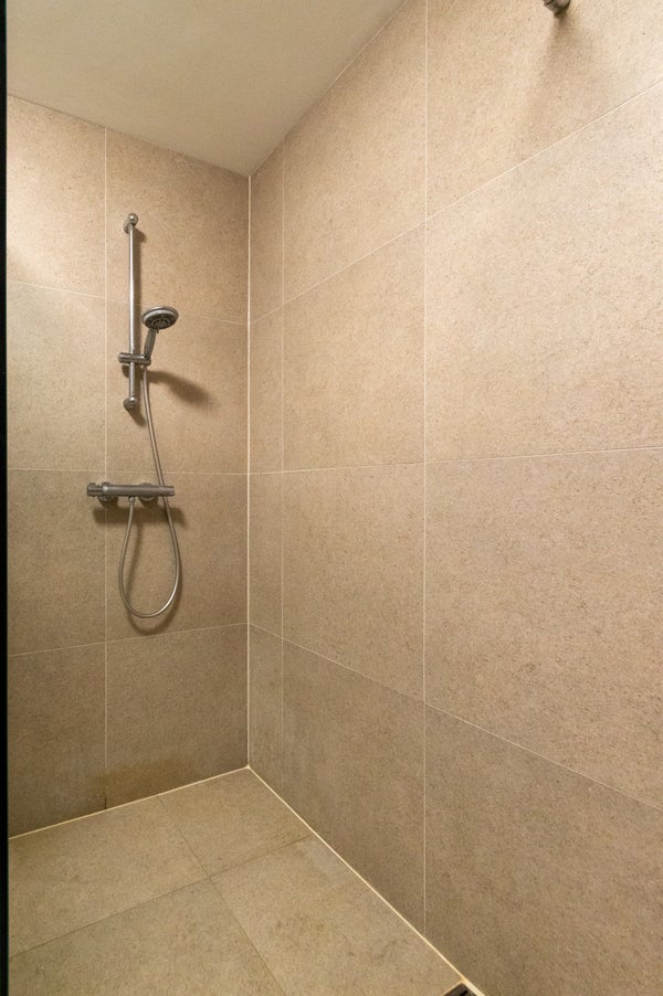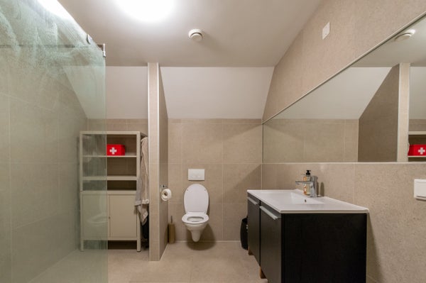 Door de gang naar de woonkamer is de badkamer te vinden. Deze moderne badkamer is voorzien van alle gemakken, zo heeft het een inloopdouche met een glazen wand, het toilet van de woning, een ruime wastafel en een brede spiegel welke van wand tot wand reikt.