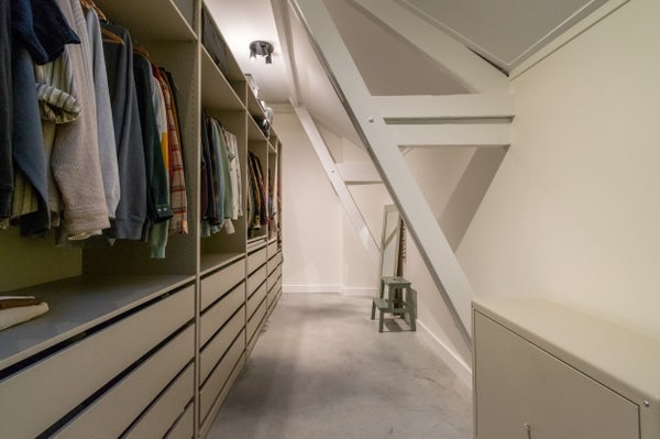 De entree van de woning is vrij ruim waardoor dit een prettige plek is om jassen en schoenen op te kunnen bergen. Vanuit hier is de technische/wasruimte meteen aan de linkerhand te vinden. Hier staan de wasmachine en droger opgesteld. Aan de linkerkant bevindt zich de eerste kamer welke is ingedeeld als ruime inloopkast.