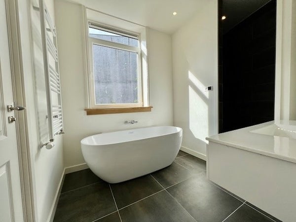 - badkamer met een design ligbad, wastafel met meubel, elektrische vloerverwarming, inloopdouche;