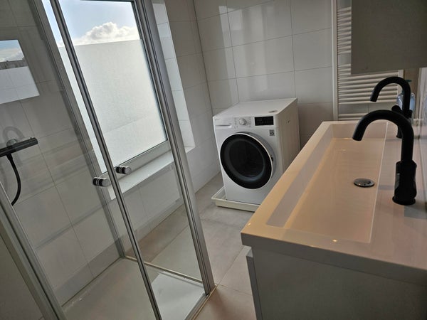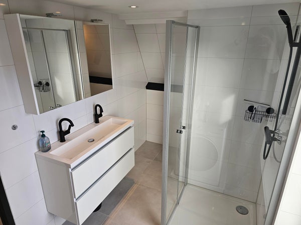 Voorin de woonkamer leidt een trap naar twee ruime slaapkamers en een luxe badkamer. De badkamer is voorzien van een dubbele wastafel, een tweede toilet, een luxe douchecabine en een aansluiting voor de wasmachine, allemaal afgewerkt met elegante zwarte kranen en accessoires. Dit appartement is echt een pareltje in een prachtige buurt.