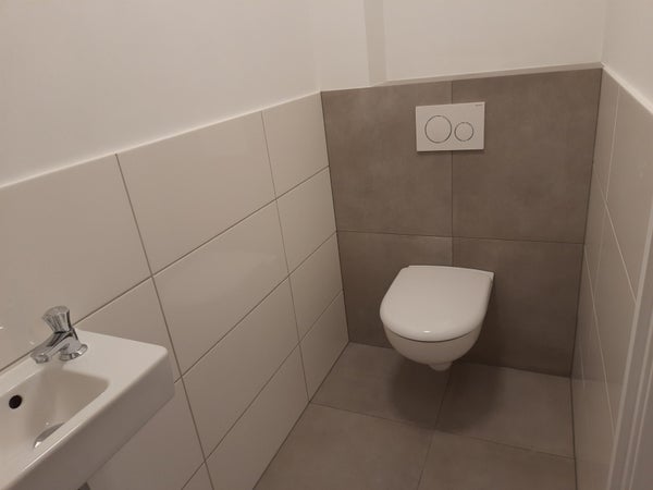 Begane grond: entree, gang met vaste trapkast met aansluitingen voor de wasmachine en droger, ruime toiletruimte met zwevend toilet en fontein.