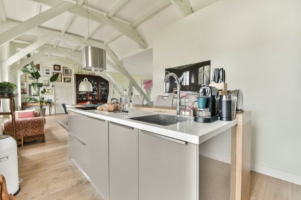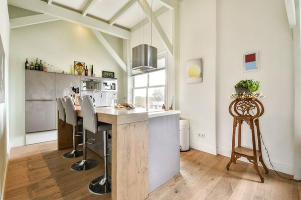 De woonkamer biedt goede mogelijkheden voor een thuiswerkende situatie en is onder meer uitgevoerd met een houtkachel voor extra sfeer in de woning. De open keuken is van alle gemakken voorzien, waaronder een inductiekookplaat, Quooker, oven-magnetroncombinatie, ingebouwd koffiezetapparaat en koelkast.