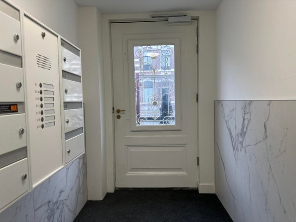 Toegang tot het appartement via de gemeenschappelijke entree op de begane grond, met trap en lift naar de eerste verdieping.