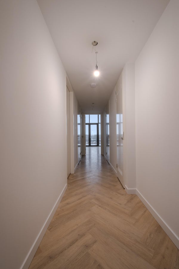 Via de centrale entree op de begane grond brengt de lift je naar het dakniveau, waar je uitkomt op het gezamenlijke dakterras en de voordeur van de woning. Binnen leidt de hal naar twee slaapkamers, de badkamer, een separaat toilet, een inpandige berging en de lichte woonkamer met open keuken. Vanuit de woonkamer heb je direct toegang tot het dakterras.