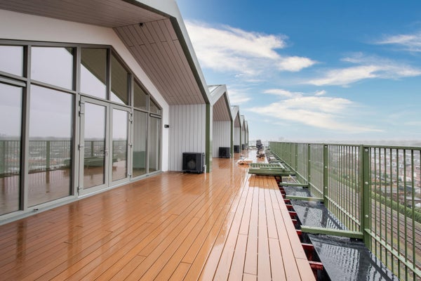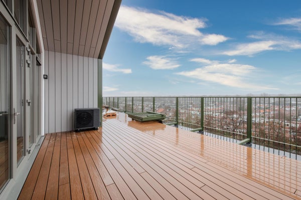 Aan de voorzijde heb je ook een eigen ruimte en kijk je uit op de groene, gemeenschappelijke daktuin – een exclusieve plek voor bewoners om even te ontspannen.