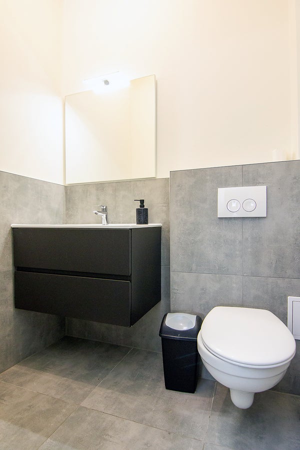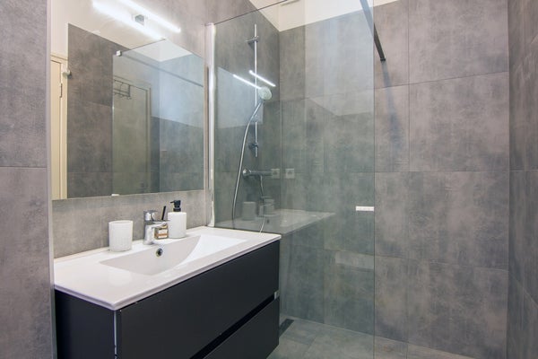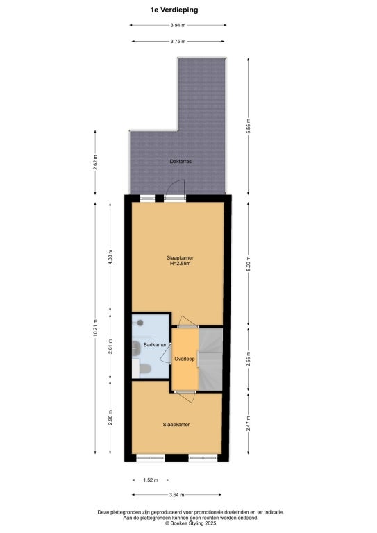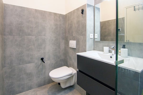 Eerste verdieping: overloop, slaapkamer aan de voorzijde, royale badkamer met luxe afwerking, slaapkamer aan de achterzijde met directe toegang tot het dakterras.