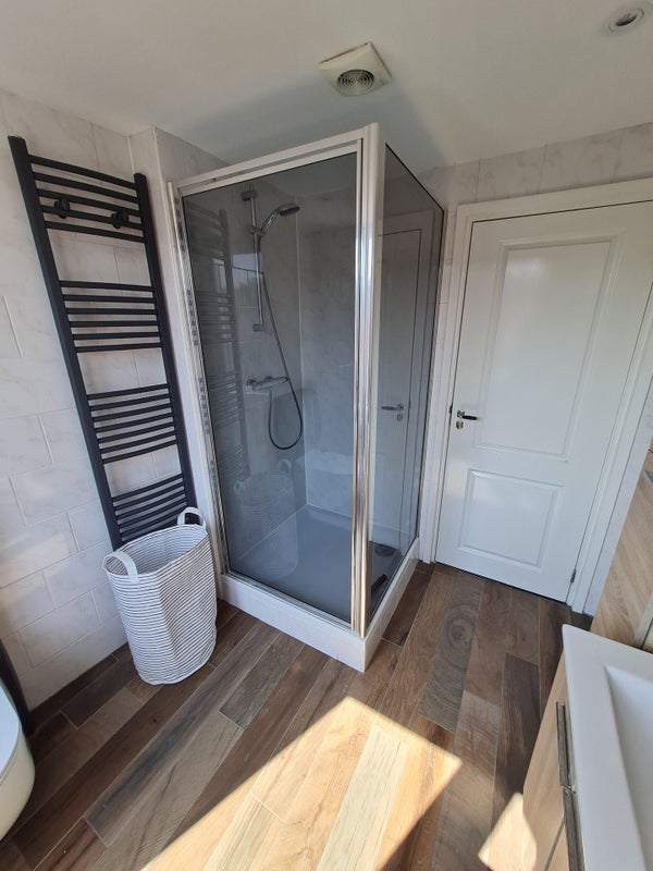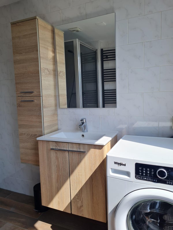 2e verdieping: overloop, hoofdslaapkamer met een tweepersoonsbed, grote kledingkast, gasten slaapkamer met een eenpersoonsbed (uitbreidbaar tot een tweepersoonsbed), werkkamer en een moderne badkamer met douche, wastafel, 2e toilet, wasmachine en droger.