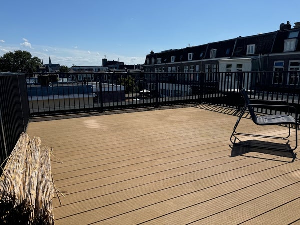 Hal, voordeur, ruime en brede woonkamer die zeer goed is in te delen met een open keuken voorzien van alle benodigde apparatuur; koelkast, ruime vriezer, inductieplaat, vaatwasser en oven combinatie. Vanuit de woonkamer vervolgens door de gang zijn zowel de badkamer als beide slaapkamers te bereiken en een apart toilet. Beide kamers meer dan volwaardig met mooie op maat gemaakte inbouwkasten. Moderne badkamer met sfeervol wasmeubel en riante inloopdouche. Grenzend aan de badkamer bevindt zich een wasruimte waar een wasmachine geplaatst kan worden. Het hele appartement is comfortabel verwarmd met vloerverwarming. Dakterras van maar liefst ca. 30m2 te bereiken via vaste trap!