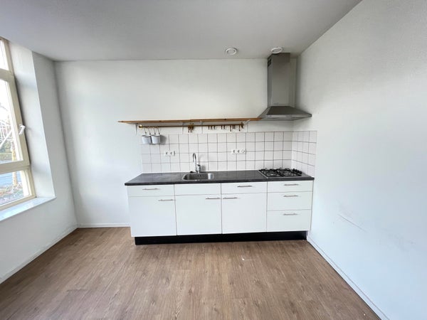 1e Etage: Privé entree/hal, ruime eetkeuken voorzien van gaskookplaat en afzuigkap, ruime woon of slaapkamer voorzijde, slaapkamer achterzijde, extra slaapkamer, nette badkamer met wastafel, douche en aparte toilet.