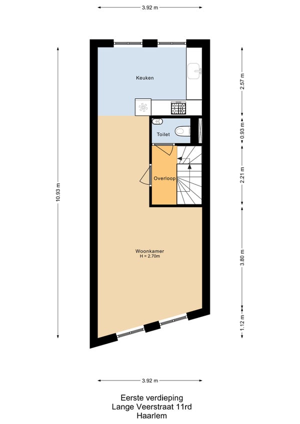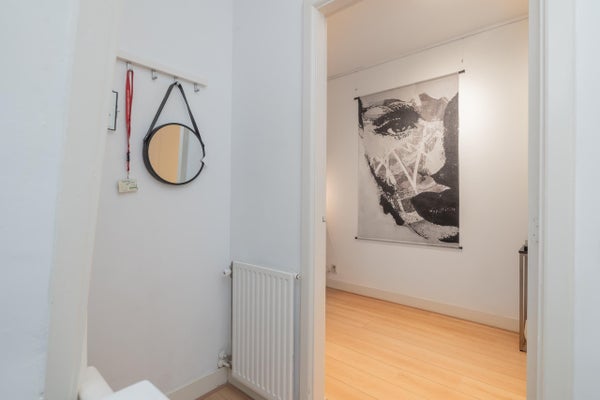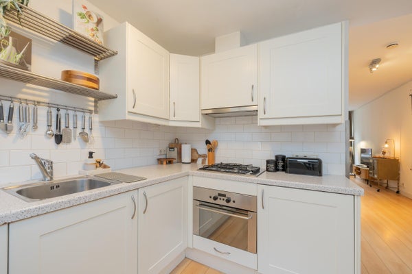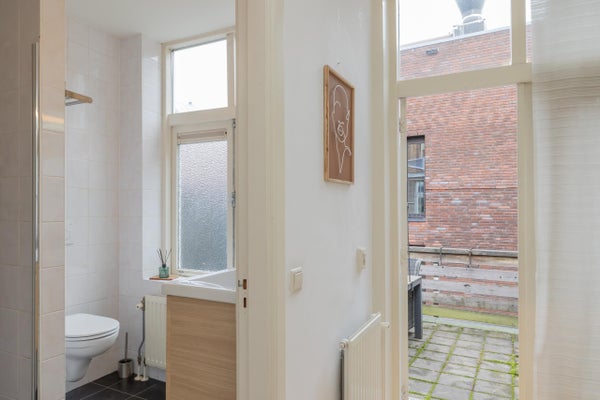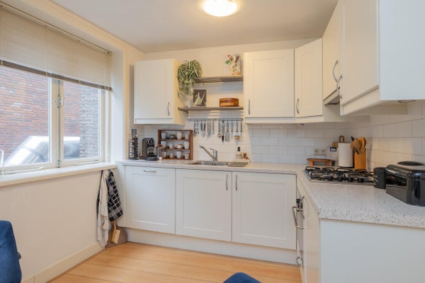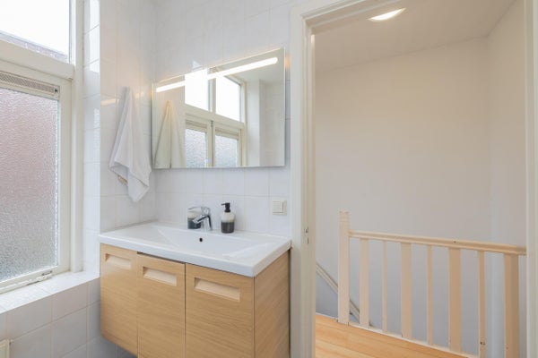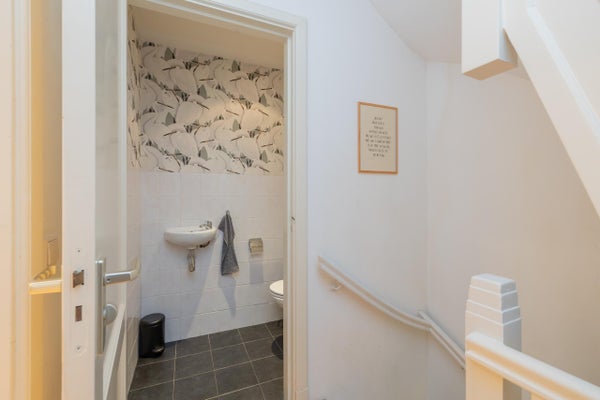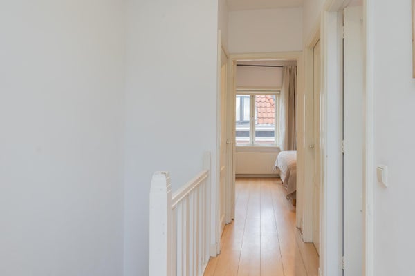 Eerste verdieping: De centrale overloop leidt naar een ruim toilet en de trap naar de tweede verdieping. De ruime en lichte woonkamer ligt aan de voorzijde en biedt een levendig uitzicht op de straat. Aan de achterzijde vind je de keuken in L-opstelling, compleet met vaatwasser, gasfornuis met afzuigkap, combimagnetron en koelkast.