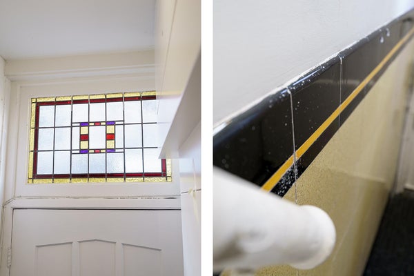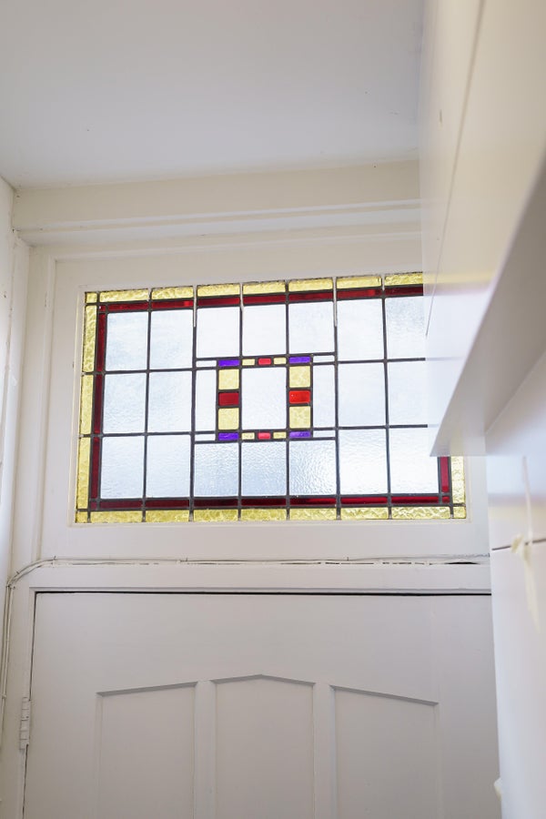 Parterre: Entree, ruime hal met origineel tegelwerk, glas-in-lood raam en meterkast, brede trap naar...