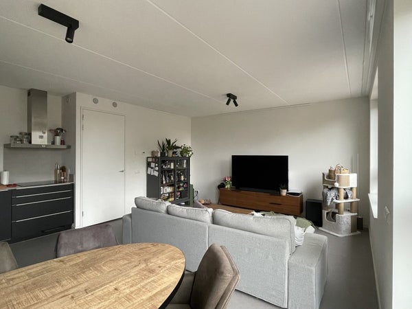 Bij binnenkomst valt meteen de strakke afwerking op: een lichtgrijze PVC-vloer loopt door het gehele appartement en vormt een rustige basis in combinatie met de wit afgewerkte wanden en plafonds. De woonkamer is ruim en licht, en voorzien van zwarte plafondspots met energiezuinige LED-verlichting. Ook is er gedacht aan praktische extra’s zoals dubbele gordijnrails en een schilderij-ophangsysteem.