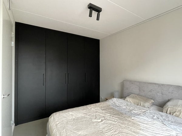 In de slaapkamer bevindt zich een royale 4-deurs kastenwand in zwart melamine – een luxe toevoeging die veel opbergruimte biedt.