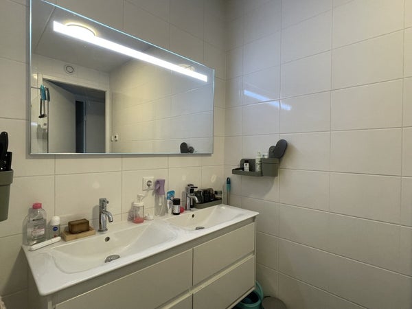 De moderne badkamer beschikt over een douchecabine, een stijlvol badmeubel met dubbele wastafel en vier ruime laden, en een verlichte anti-condens spiegel. Het toilet is separaat en uitgevoerd als hangtoilet.