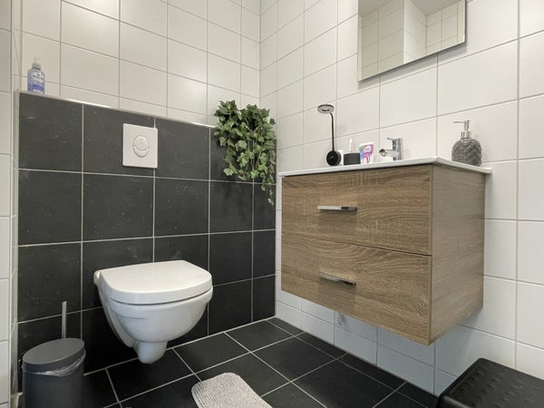 De badkamer is strak en modern uitgevoerd met een inloopdouche, zwevend toilet en een wastafelmeubel. Daarnaast is er een inpandige berging met aansluiting voor de wasmachine.