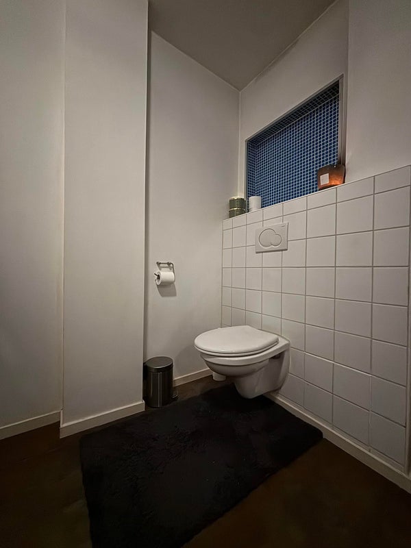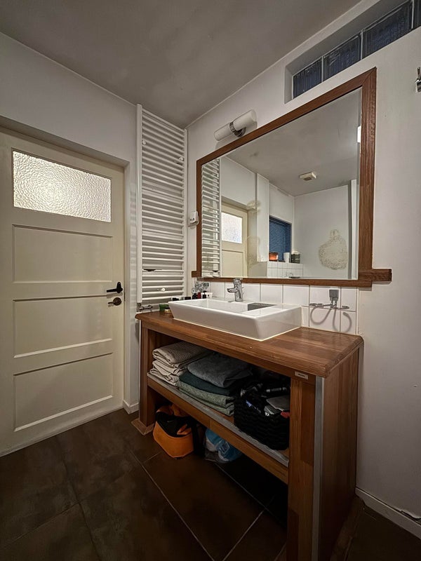 De badkamer is voorzien van toilet, bad met douche, wastafel en handdoekenradiator.