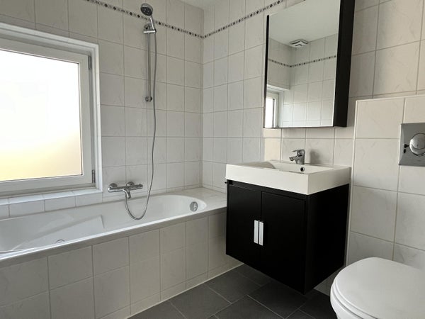 De badkamer is voorzien van een bubbelbad/douche, toilet en wastafel.