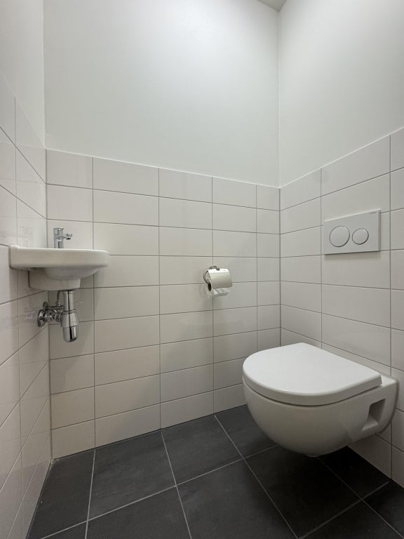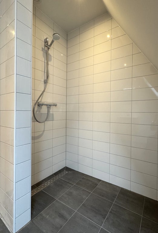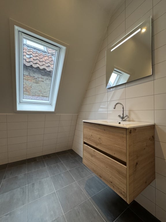 De moderne badkamer is uitgerust met een inloopdouche en wastafelmeubel. Het toilet is apart gesitueerd.