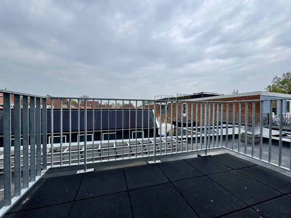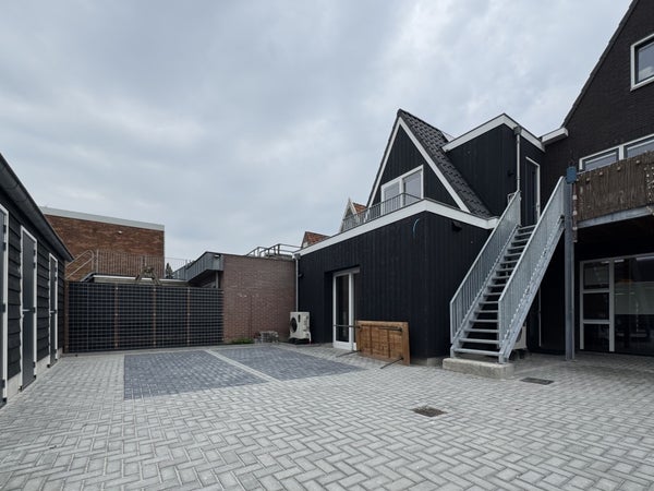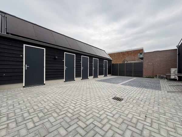 De ingang van het appartement bevindt zich aan de achterzijde van het pand. Hier vind je tevens de bijbehorende bergingen en kun je optioneel een parkeerplaats erbij huren.