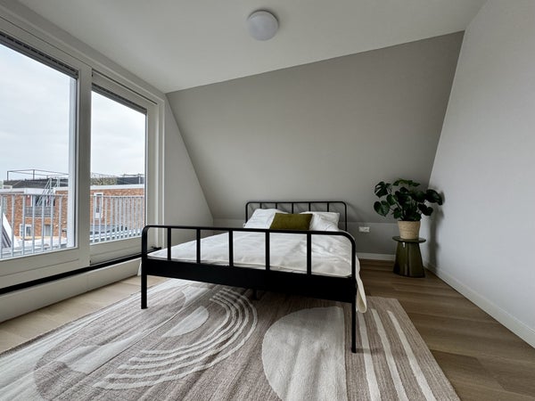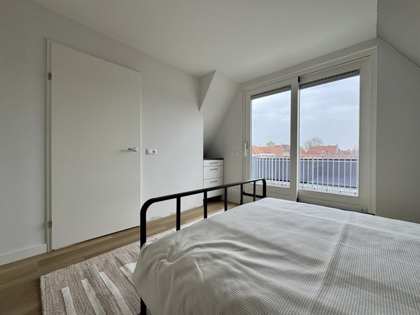 Via de hal bereik je de masterbedroom, die tevens toegang biedt tot een eigen balkon. Daarnaast beschikt het appartement over een aparte wasruimte en een extra (kleed)kamer.