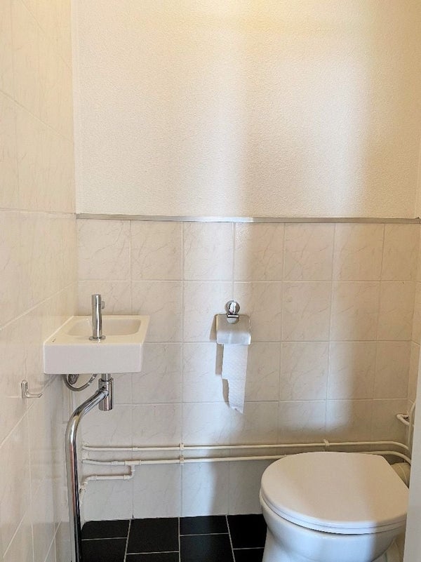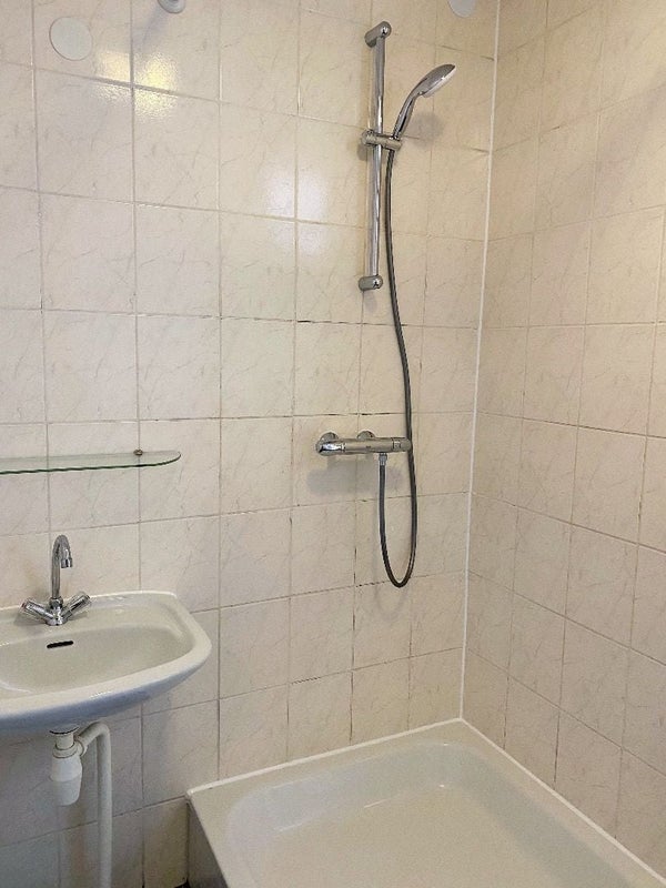 Badkamer met douche, vaste wastafel en alwaar aansluiting wasapparatuur