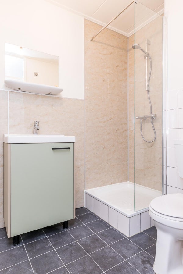 Betegelde badkamer met douche, toilet, vaste wastafel en wasmachine aansluiting - (2,61 x 1,59)