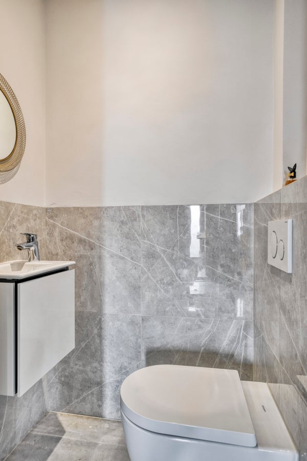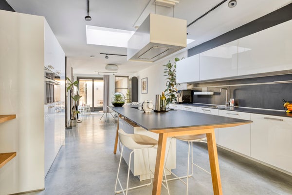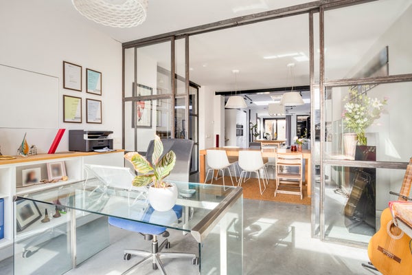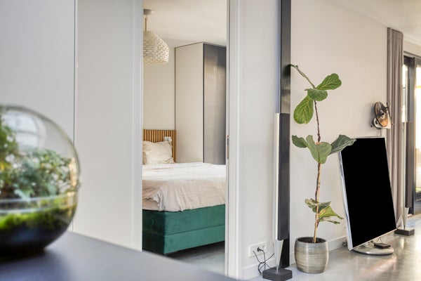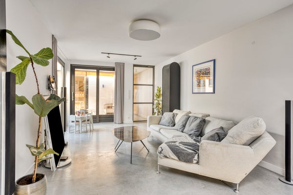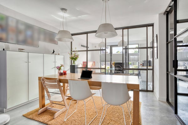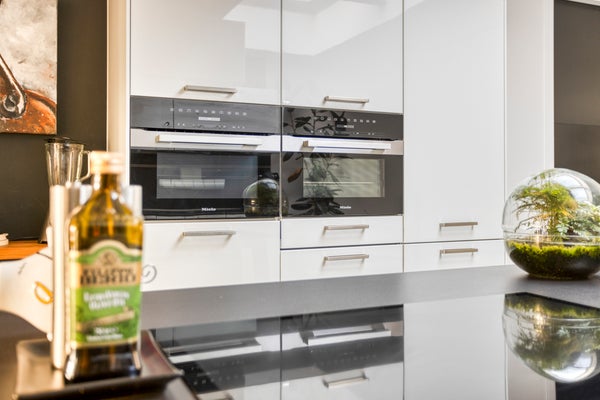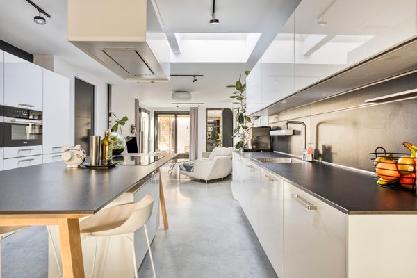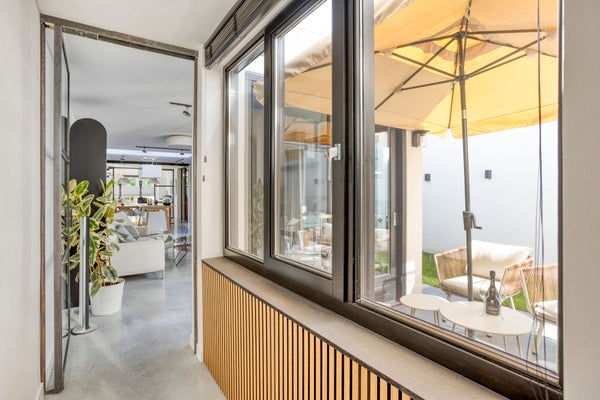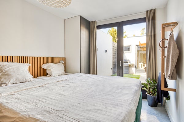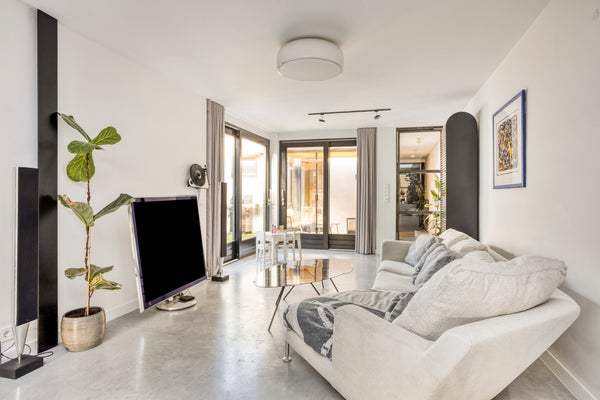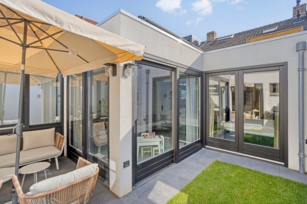 This completely renovated object has a layout for many purposes. Even a small office or practice at home is possible. Or music room, children's room......At the front there is even an extra entrance available for this (privacy guaranteed). This space can be closed off on the living side if desired (with stylish sliding doors). Entrance (via small enclosed front garden) with up-to-date meter cupboard, portal (with trendy sliding wall) for wardrobe, laundry equipment, other white goods, supplies and technical installation (Nefit HR). Beautiful guest toilet with wall closet and washbasin. Beautiful glass doors/glass wall with steel to the living room where the kitchen immediately takes a rightfully prominent place. The luxury kitchen divides the living room on one side as an office/home workplace/practice and dining area and on the other side as a cozy television/relaxation corner with a view of the patio/inner garden (with double sliding doors). Excellent skylight, sleek finish with many light shades. The kitchen is complete with cooking island (induction) and various Miele appliances, dishwasher etc.