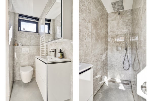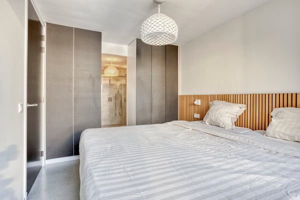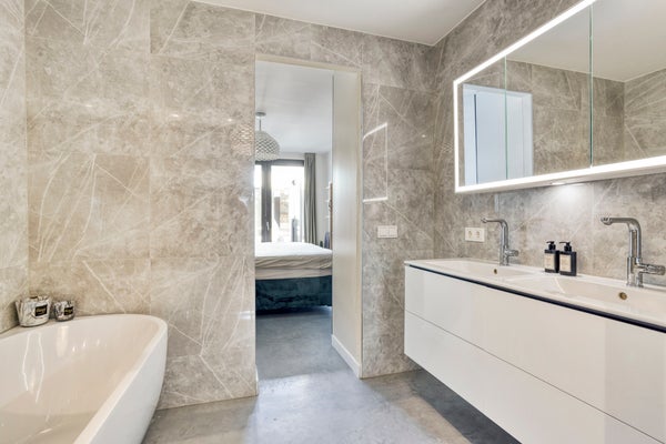 Via a hallway to the second bedroom with private bathroom. From this bedroom there is also a view of the patio. Luxurious bathroom with walk-in shower, sink with furniture and a (third) wall closet.