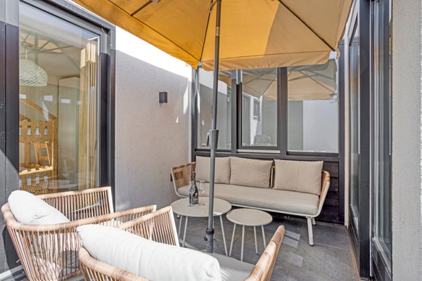 Through the passage/hall you reach the rear of this unique residential property where there is space to park a car (lockable by gate). Storage for bicycles, garden supplies etc. The patio garden (accessible from the master bedroom, second bedroom and living room) offers 100% privacy and is a pleasure to stay in.