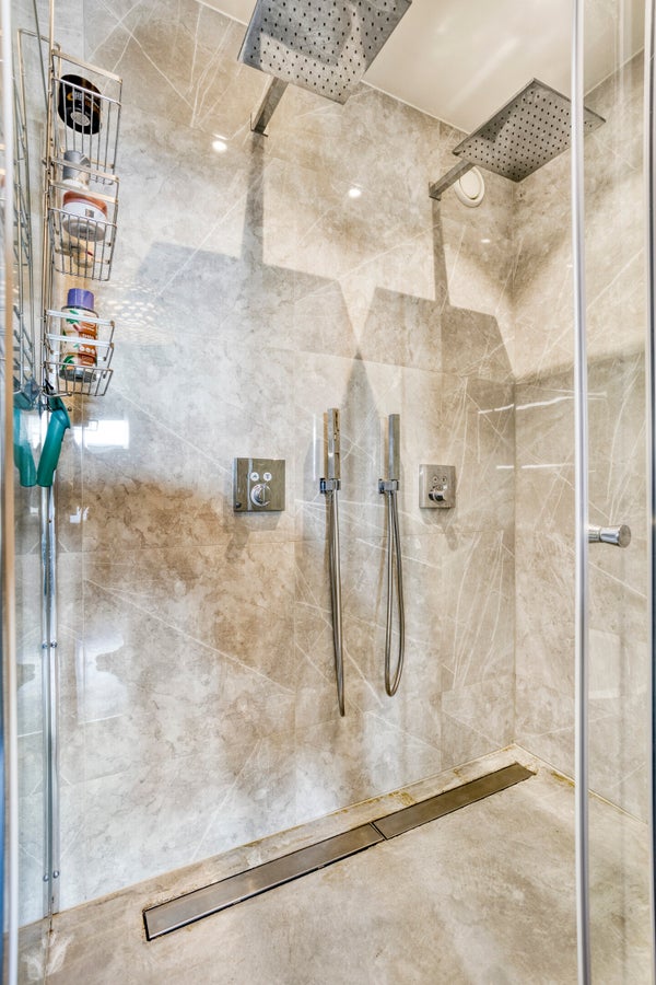 Masterbedroom met deuren naar de patio. Aansluitend een royale en zeer luxe badkamer met ligbad, wandcloset, dubbele wastafel met meubel en als hoogtepunt een inloopdouche met duo-shower faciliteit. Hoogwaardige afwerking met high-end kranen, bediening etc.