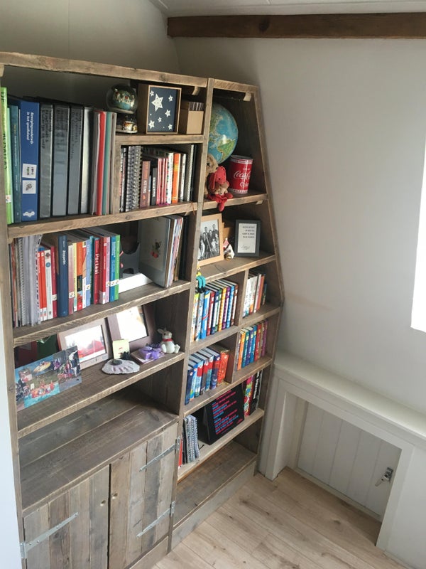 Eerste etage: halletje, badkamer met een tweede toilet, woonkamer en slaapkamer. De slaapkamer heeft nog een vide welke via de losse trap te bereiken is. Deze dient als extra opbergruimte.