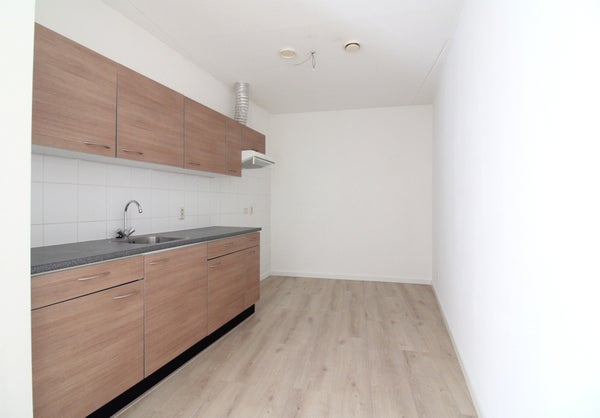 Semi-openkeuken voorzien van boven- en onderkasten, spoelbak en wasemkap.