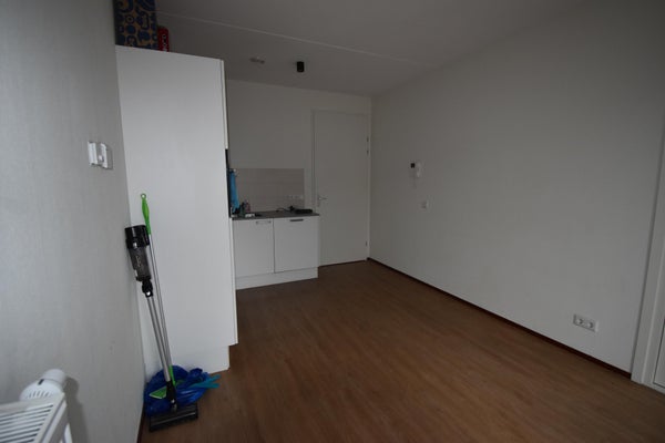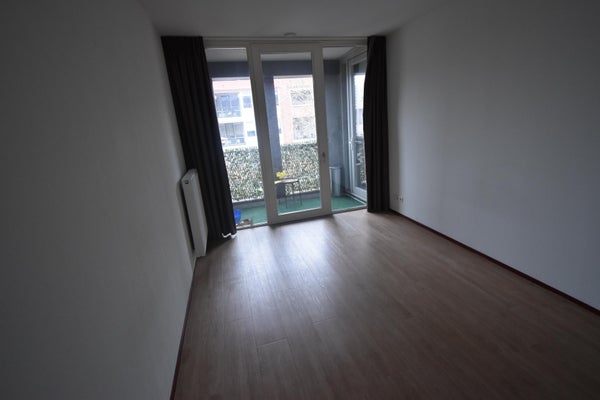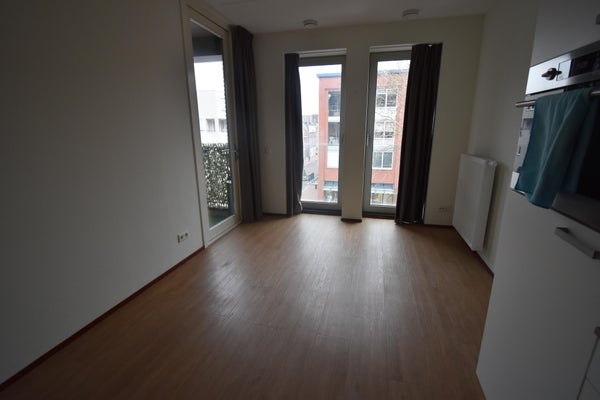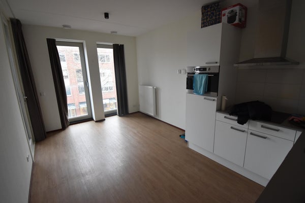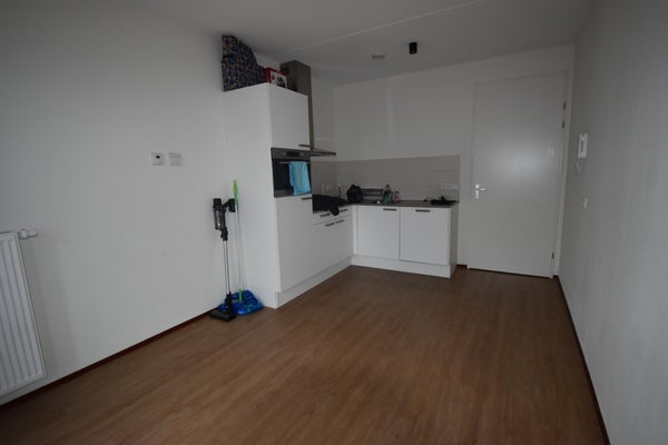 De woonkamer is voorzien van voldoende raampartijen en het inpandig balkon is te bereiken via de woonkamer en/of de slaapkamer van het appartement. De open keuken, in L-opstelling, is voorzien van een kookplaat, afzuigkap, koelkast en combimagnetron.
