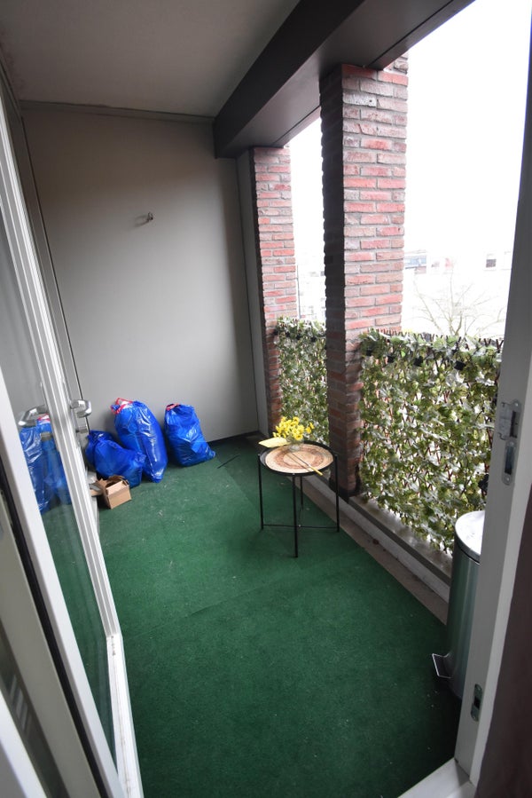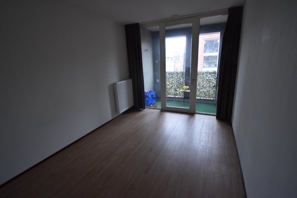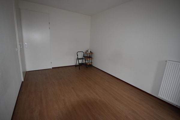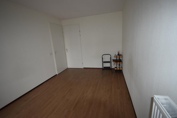 De slaapkamer heeft, net als de woonkamer, een draai-kiep raamkozijn en van hieruit is het balkon ook bereikbaar. In de vaste bergkast van het appartement is de warmtepomp weggewerkt.