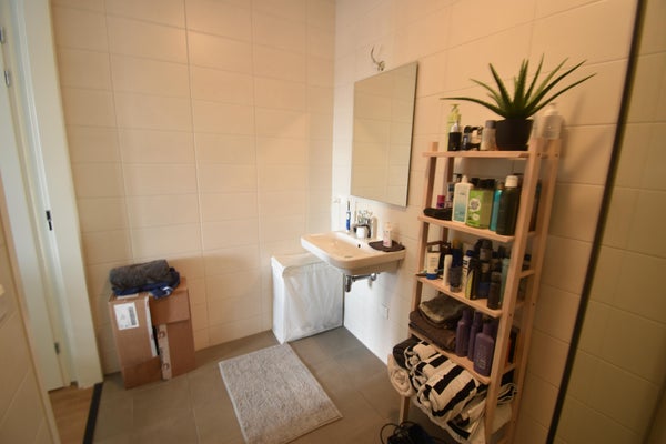 De badkamer beschikt over een toilet, douche, wastafel, designradiator en de aansluiting voor de wasmachine.