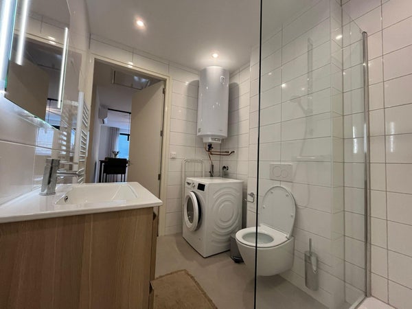Vanuit de hal is tevens de moderne volledig betegelde badkamer bereikbaar, welke is voorzien van een inloopdouche, wastafel met meubel, een hangend toilet, handdoekenradiator en een wasmachine.