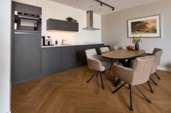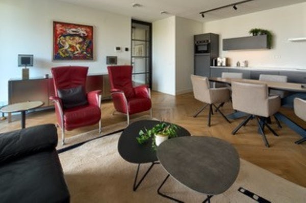 De keuken is modern en volledig uitgerust met inbouwapparatuur van hoge kwaliteit. De slaapkamer is ruim en comfortabel, en de badkamer is luxe uitgevoerd met moderne tegels, inloopdouche en een strak wastafelmeubel.