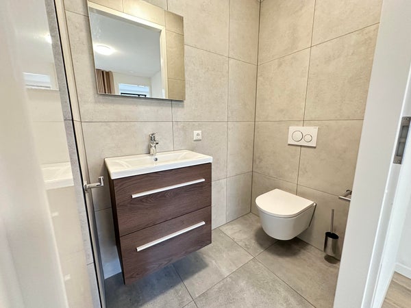 De slaapkamer van ca. 11 m² is gelegen aan de achterzijde en geeft toegang tot de loggia. Moderne en luxe afgewerkte badkamer voorzien van wastafel met meubel en inloopdouche met hand- en regendouche. De badkamer is volledig betegeld.