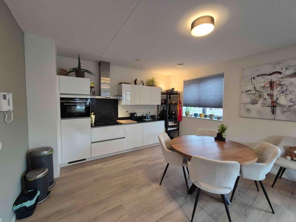 - Woonkamer met open keuken voorzien van diverse inbouwapparatuur waaronder koelkast, inductiekookplaat, combimagnetron, vaatwasser en recirculatieafzuigkap;