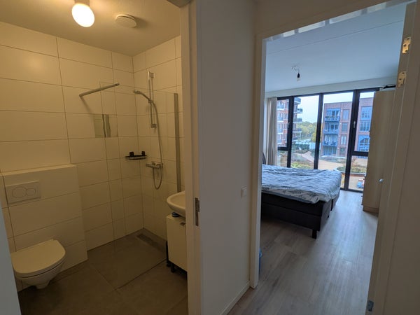 - Betegelde badkamer voorzien van inloopdouche en wastafel;